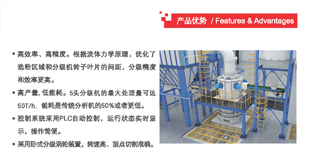 有別于傳統環輥磨,搭載多頭選粉機的主機設備將整體產能與質量再上一個臺階,產成品細度可由原先325-1500目躍升至1500-3000目。