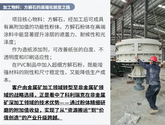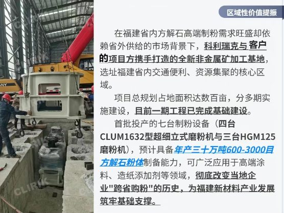 在國家大力推進新型工業、加快發展新質生產力的戰略背景下,非金屬礦加工行業正迎來智能化、綠色化、高端化轉型的窗口期。隨著《"十四五"原材料工業發展規劃》對非金屬礦物材料產業高質量發展的明確指引,以及高端制造業對超細粉體材料需求的持續攀升,行業已從傳統加工模式向"精細化、功能化、集群化"發展階段加速邁進。作為非金屬礦加工領域的重要技術參與者,科利瑞克深度參與的福建方解石制粉項目,正是這一區域性變革項目的落地,該省級示范工程——不僅填補了福建區域性自造高端方解石粉體生產的空白,更通過"設備集群+智能工藝+綠色布局"的創新模式,為非金屬礦行業轉型升級提供了可復制的解決方案。