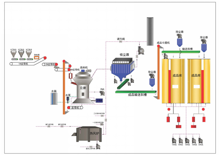 堆放著的礦渣由鏟車取料、喂料,通過皮帶機進行輸送。在輸送過程中,礦渣原料先后經由除鐵器和振動篩得到除鐵和篩分,然后通過稱重設備倉、提升機進入礦渣立磨機進行粉磨。粉磨后的礦渣借助熱風爐提供的熱風,通過選粉機進行選粉,同時得到烘干。符合細度要求的礦渣粉較后被輸送到收塵器收集、盛放后,由空氣輸送斜槽、提升機進入成品庫中儲存。